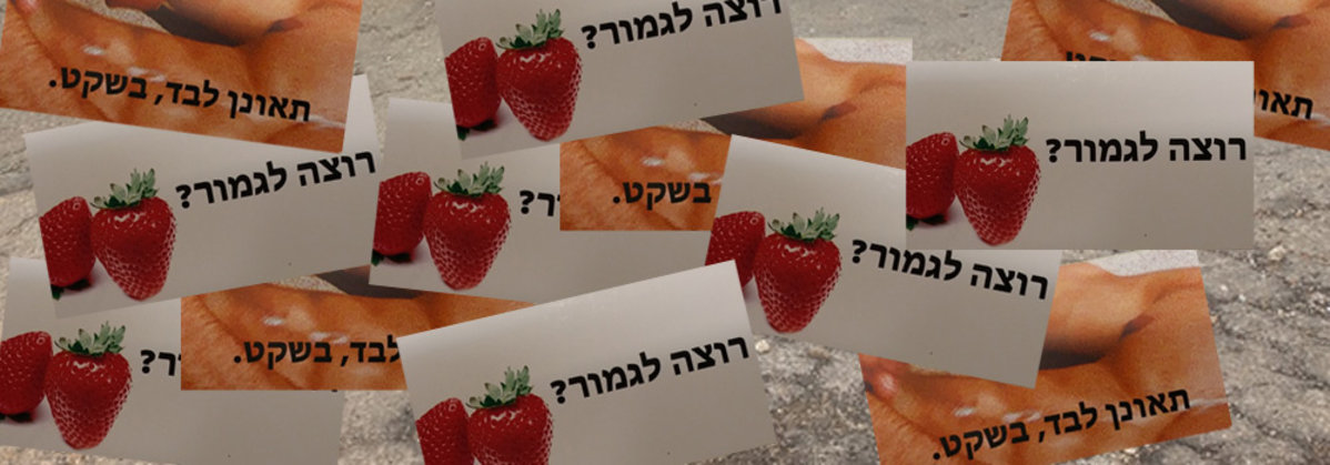וננה בוריאן וסשה קורבטוב – שתי סטודנטיות לתואר שני בעיצוב במכללת שנקר – החלו לפני כשבוע לפזר ברחבי העיר כרטיסי ביקור דמויי אלה המפרסמים זנות, אך עם טוויסט קל. בצדם האחד כתוב "רוצה לגמור?", לצד תמונה של תותים מפתים, ובצדם השני הכיתוב "תאונן לבד, בשקט", על רקע תקריב בוטה של גבר מאונן.